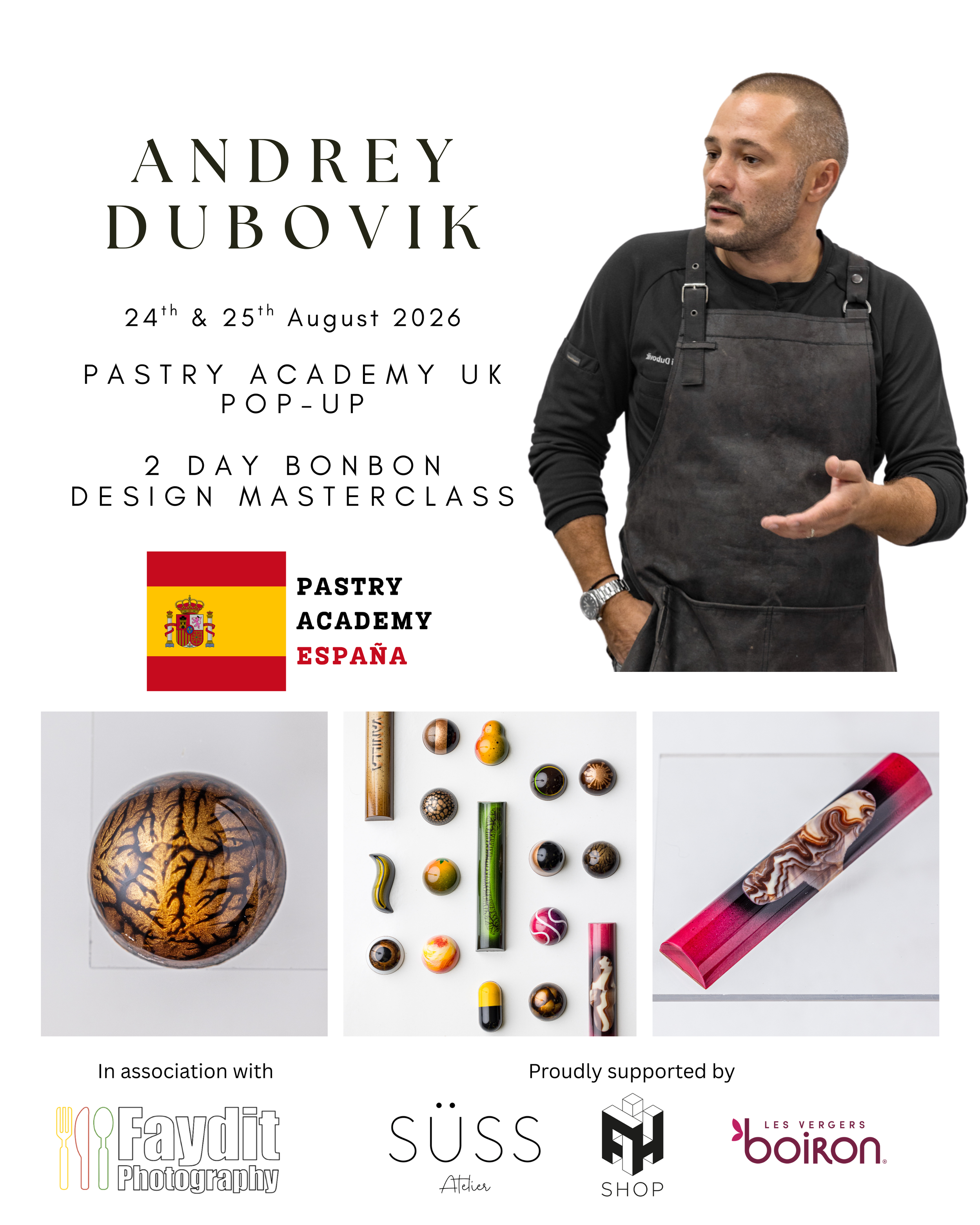 This 2-day course will be held at the Pastry Academy España ‘pop-up’ situated in the Esplugues de Llobregat area of Barcelona, and will be hosted by international chocolatier Andrey Dubovik.