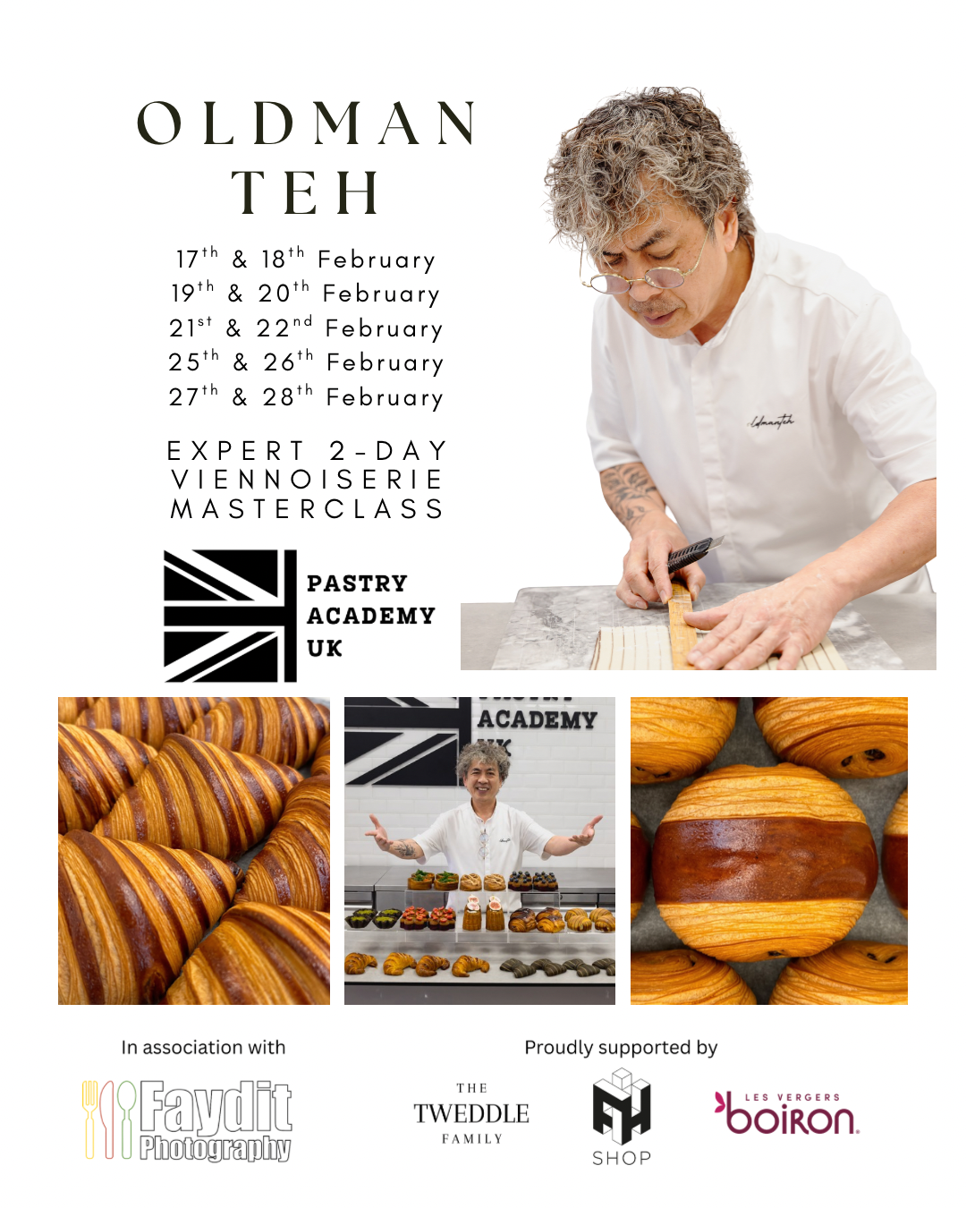 Join us for an exceptional masterclass with Oldman Teh, following the huge success of his first visit! For the first day of the class, we will focus on handrolled croissant. On the second day, we will focus fully on sheeter laminated products, culminating in a grand final display. There will be a minimum of 6 Viennoiserie created, in addition to butter croissant and pain au chocolat.