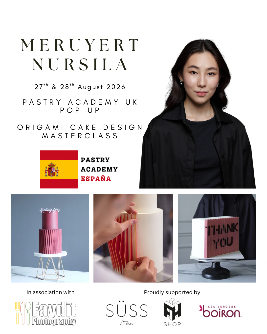 Over the 2 day masterclass, Meruyert will teach you everything needed to know to replicate her show-stopping 2-tier celebration cakes which are simply incredible. A variety of skills, techniques and recipes will be taught during the masterclass which Meruyert uses in her day to day life creating visually stunning cakes, including her signature origami-inspired cakes. There is no doubt that you will have seen Meruyert’s meticulously crafted cakes on your ‘for you page’, well now is your chance to learn all of the tips and tricks of how they are created.